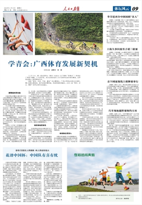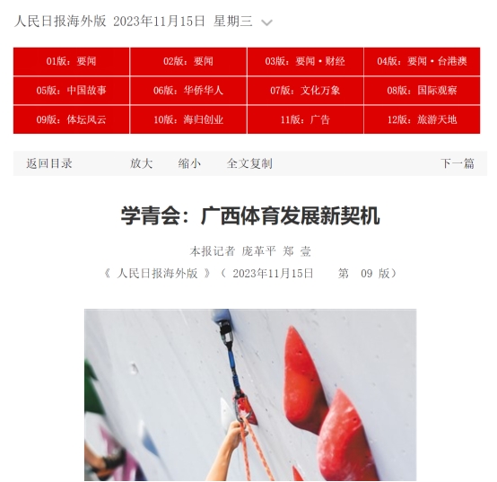 11月15日,人民日报海外版第9版显著位置发表题为《学青会:广西体育发展新契机》的报道,文章的最后一段提到了我院体教融合发展情况。