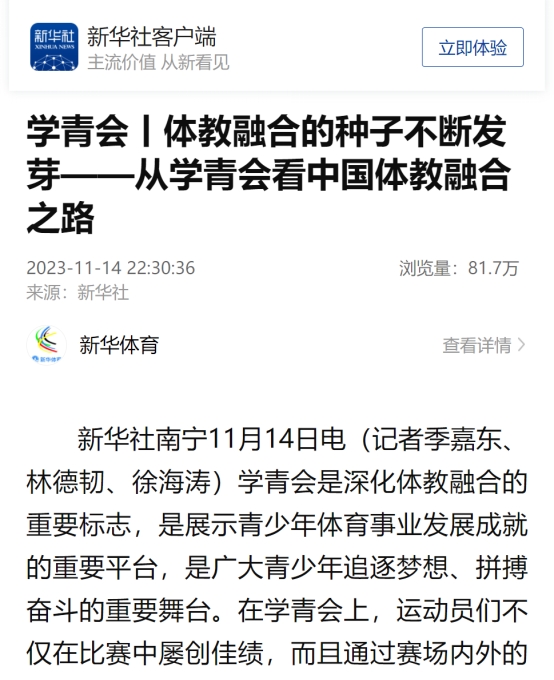 11月14日,新华社客户端也刊出题为《学青会丨体教融合的种子不断发芽——从学青会看中国体教融合之路》的文章,介绍了我院体教融合的成功案例。