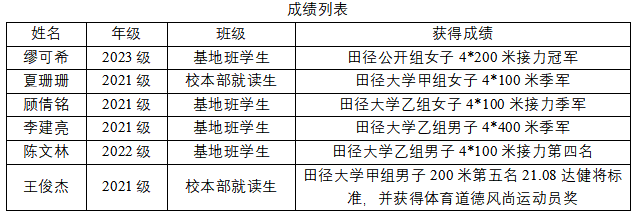特别值得一提的是,王俊杰同学在男子甲组200米预赛中以21.08秒的个人最好成绩获得小组第一,达到国家健将标准,成为我校田径队第二个在校训练达到健将级的运动员,并以总成绩排名第5进入决赛。此成绩也是广西成年男子有史以来第二好成绩,距短跑名将陈文忠在1996年亚特拉大奥运会创造的21.07区最高记录仅差0.01秒。夏珊珊同学在个人单项100米、200米比赛中虽未进入决赛,但分别以12.38秒和25.18秒创造PB,达到一级运动员标准,并在甲组女子4*100米比赛中,担任第一棒位置,以46.00秒的优异成绩夺得铜牌。曾远有同学在100米比赛中跑出10.56秒佳绩,创造个人PB和beats365(中国区)-唯一官方网站男子100米最高纪录。