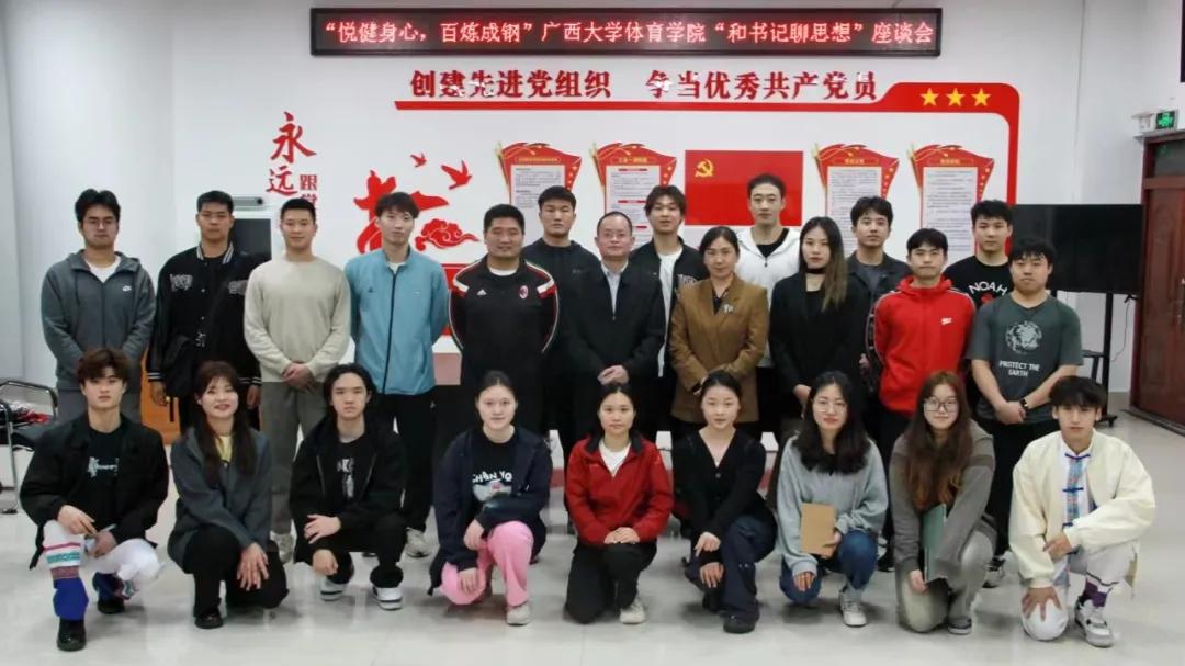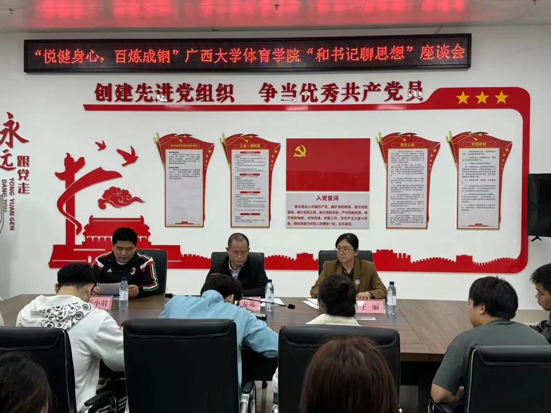 3月19日下午,“悦健身心,百炼成钢”beats365(中国区)-唯一官方网站beats365(中国区)-唯一官方网站“和书记聊思想”座谈会在学院党建活动室举行。院党委书记覃安基、副书记王丽出席座谈会,并与会同学深入交流,院团委书记伍小羽主持会议。