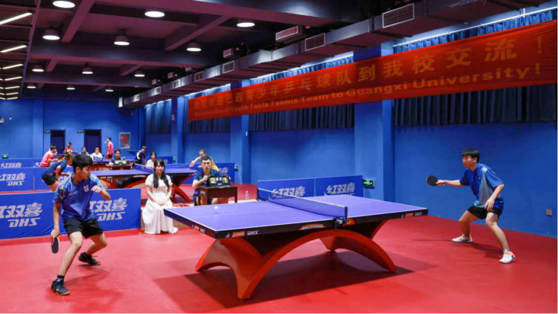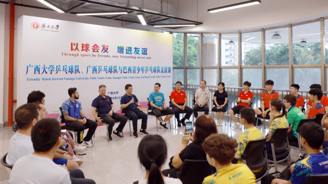 6月15日上午,巴西国家青少年乒乓球队一行12人到我校访问,与我校乒乓球队、广西乒乓球队在东校园体育馆举行了一场友谊赛,三方24名运动员在这里切磋技艺、以球会友,共同书写中巴体育交流合作新篇章。