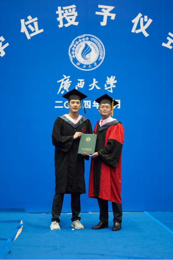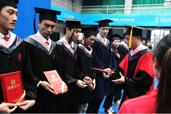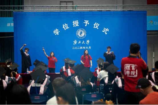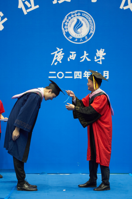 在学位授予仪式中,覃安基逐一为毕业生们拨穗并颁发学位证。拨穗礼成,寓意着毕业生学有所成,可以展翅高飞。