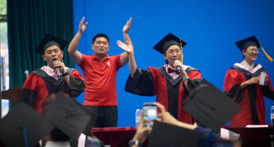 毕业典礼在师生深情演唱《这世界那么多人》《光阴的故事》《最初的梦想》《离别开出花》《凤凰花开的路口》《再见》等歌曲声中开启。