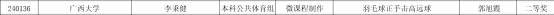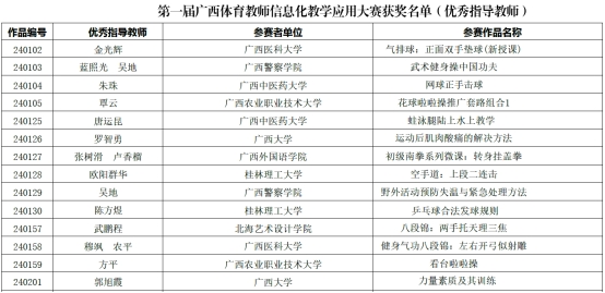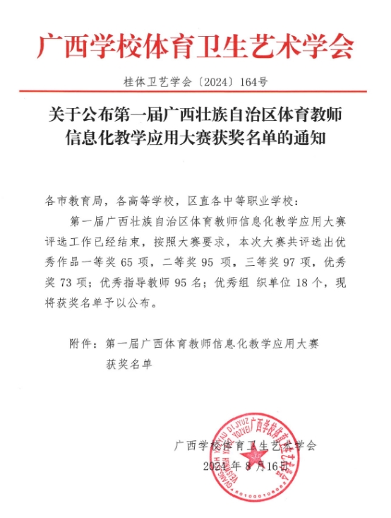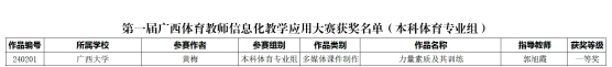 8月16日,第一届广西壮族自治区体育教师信息化教学应用大赛圆满落幕,我院教师表现出色,荣获本科体育专业组一等奖2项、二等奖2项,他们是:黄梅老师的多媒体课件作品《力量素质及其训练》、杨凝祺和伍尚柏老师合作制作的微课作品《运动后肌肉酸痛的解决方法》双双荣获一等奖,刘旭明老师的微课作品《吃动平衡与运动营养》和李秉健老师的微课作品《羽毛球正手击高远球》双双荣获二等奖。