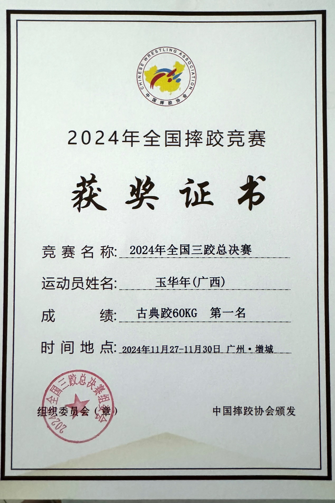 2024年11月27至30日,由国家体育总局举重摔跤柔道运动管理中心主办的2024年全国三跤总决赛在广州市增城区举行,我院2023级本科生玉华年、2024级研究生何飞鸿代表广西摔跤队出战,分别夺得60KG级、63KG级冠军,为广西争得荣誉。