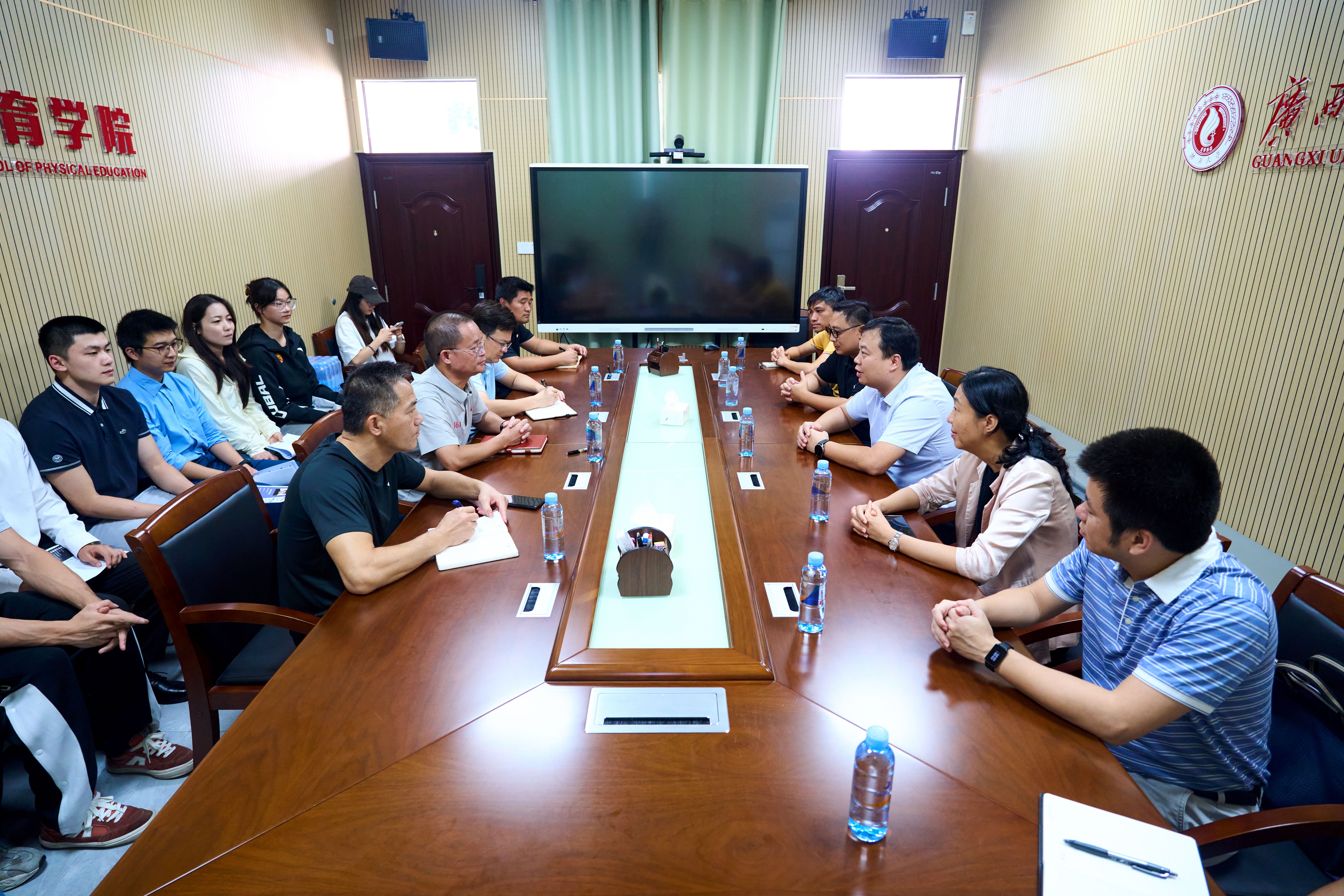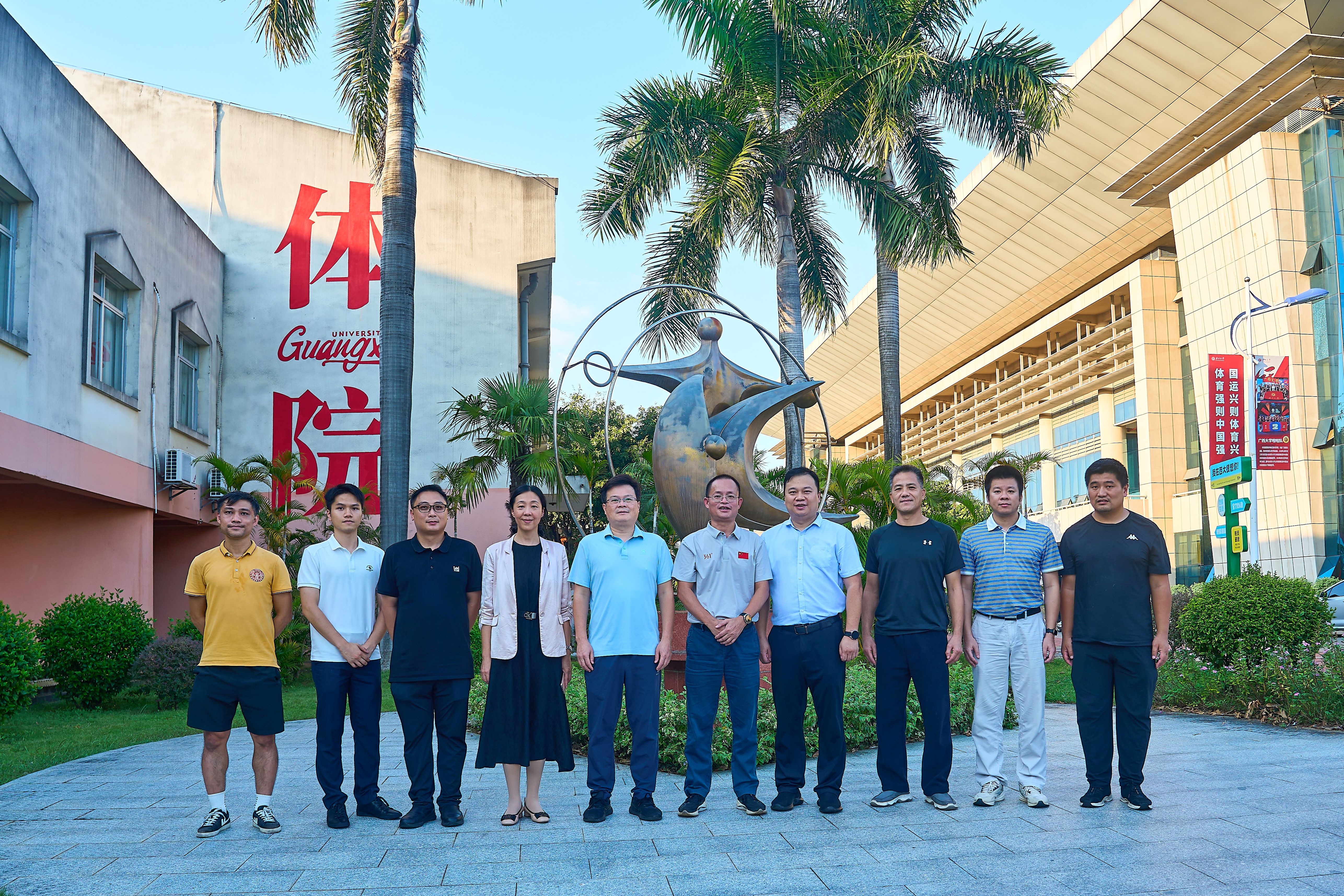 2025年10月16日,广西国控资本运营集团有限责任公司人力资源部部长林国超一行到我院调研,院党委书记覃安基率领学院领导班子全体成员及部分师生代表热情迎接了林国超一行,宾主双方在学院二楼会议室召开座谈会,就人才培养、高水平运动员输送等议题开展深入交流,并于会后现场观看了篮球队、足球队等队伍训练情况。