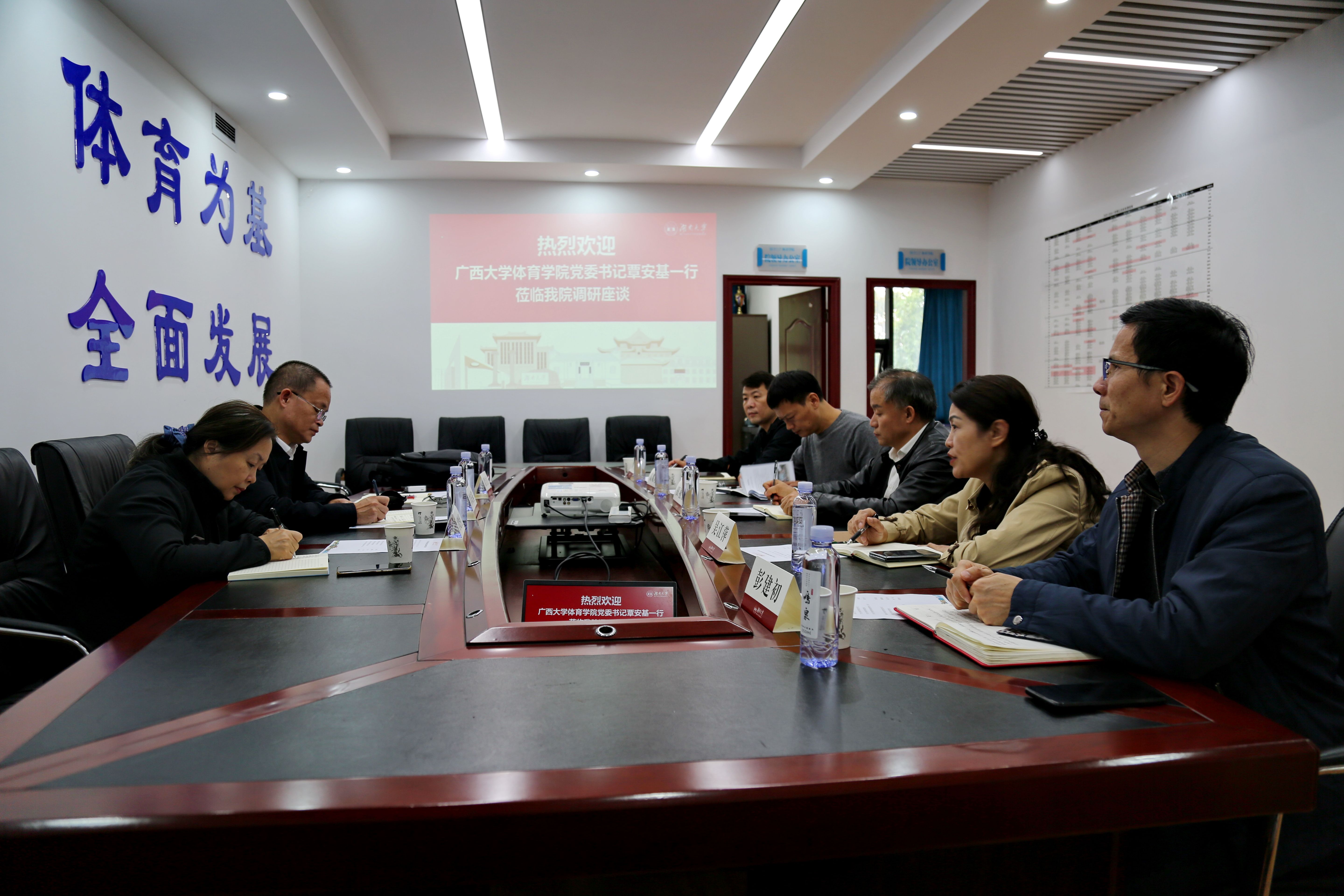 11月11日,院党委书记覃安基带队赴湖南大学beats365(中国区)-唯一官方网站调研交流。湖南大学beats365(中国区)-唯一官方网站党委书记田祖国、院长高耀鸿等领导热情迎接了覃安基一行,双方在学院会议室召开座谈会,聚焦公体课教学管理、场馆管理、运动队建设管理主题展开深入交流,彼此交换心得,均感收获良多。座谈会结束后,湖南大学党委副书记唐珍名亲切接见了西大调研组,对本次两院交流取得的成果表示赞赏。